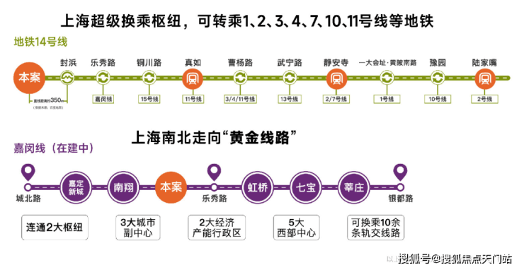 交通能级不断跃升:14号线和嘉闵线(在建中)双轨交汇,直线距离约350米14号线地铁口,14号线为高能级地铁线,5站普陀,直达静安,且始发有座,出行舒适;黄金走廊嘉闵线加速建设,约3站虹桥枢纽,未来可速达七宝、徐家汇、莘庄等核心区域。项目周边开泰路即将建成,绿野谷二期路段、骏达路、童家桥路、昌瑞路、涟澜路已启动建设,预计2026年建成。