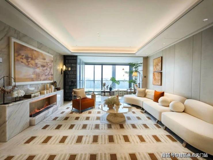 脚下的地也没有被遗忘,客厅地面和部分背景墙是白金沙岩板(建面约140㎡则是罗马白洞石岩板);样板间实拍图