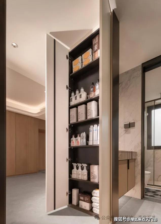 双薄柜设计 则大大增加容纳空间,举例来讲,可容纳约200包纸巾,足以满足全家1年使用。而洞洞板设计,则可收纳清洁工具、长柄伞等大件日常用品,如此贴心布局,保证室内物品足够井然有序,也更为利于家庭日常打扫。