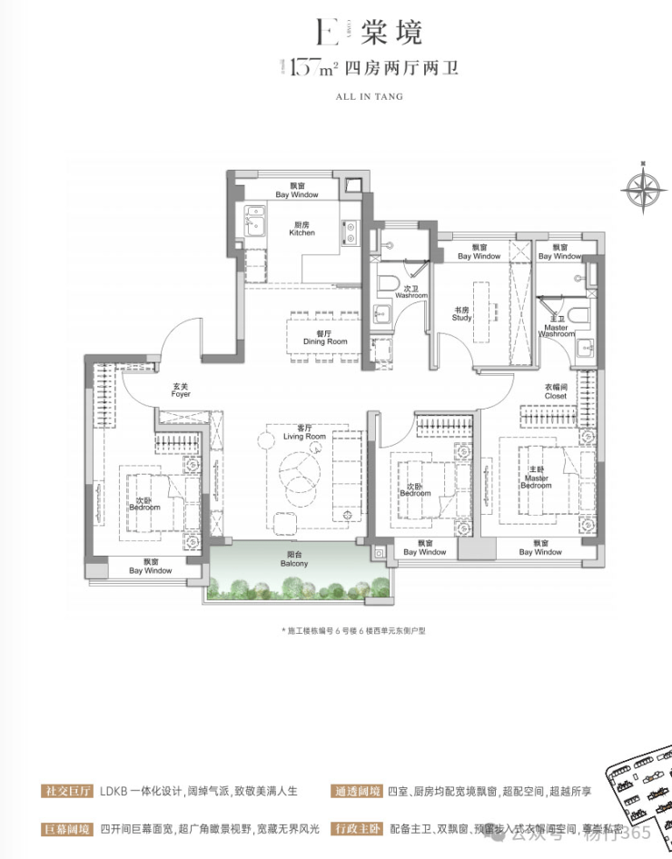 建面约105 ㎡3房2厅2卫,做到了 三开间朝南 + 4个飘窗+双面阳台系统 +主卧套房设计+270°转角飘窗,该户型的居住体验、舒适度、尺度感,是同级别产品所无法比拟的。