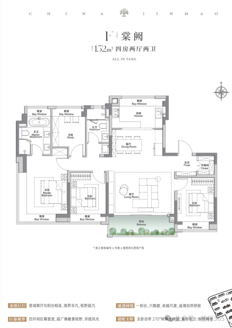 主卧带270°转角 飘窗+卫生间 ,拥有寰宇级瞰景视野,让业主有更好的私密性和生活舒适度。
