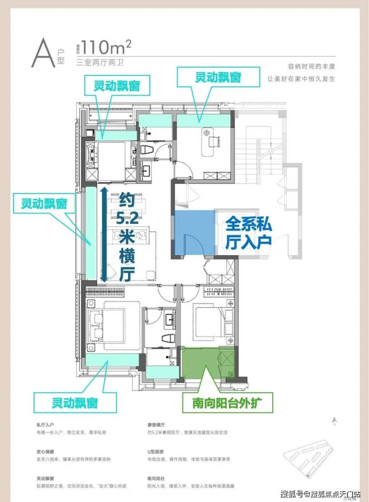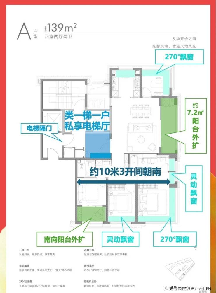 户型设计全屋飘窗与大尺度阳台,采光度全面提升,空间感倍增! 全屋赠送飘窗面积约12㎡ (不计容) 可自主改造,阳台总面积约14㎡ (一半计容) 搭配约7㎡的入户私厅,户型实得率超高!