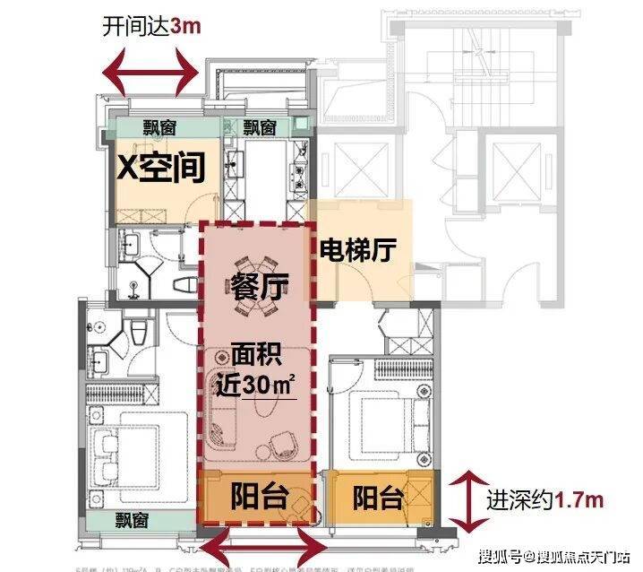 厨房飘窗拓展为实用收纳区,告别传统“飘窗+薄柜”的配置,实现功能与尺度的双重升级。 客厅开间达3.6米,连接约1.7米进深阳台,客餐厅总面积约30㎡,视野开阔,活动自如。