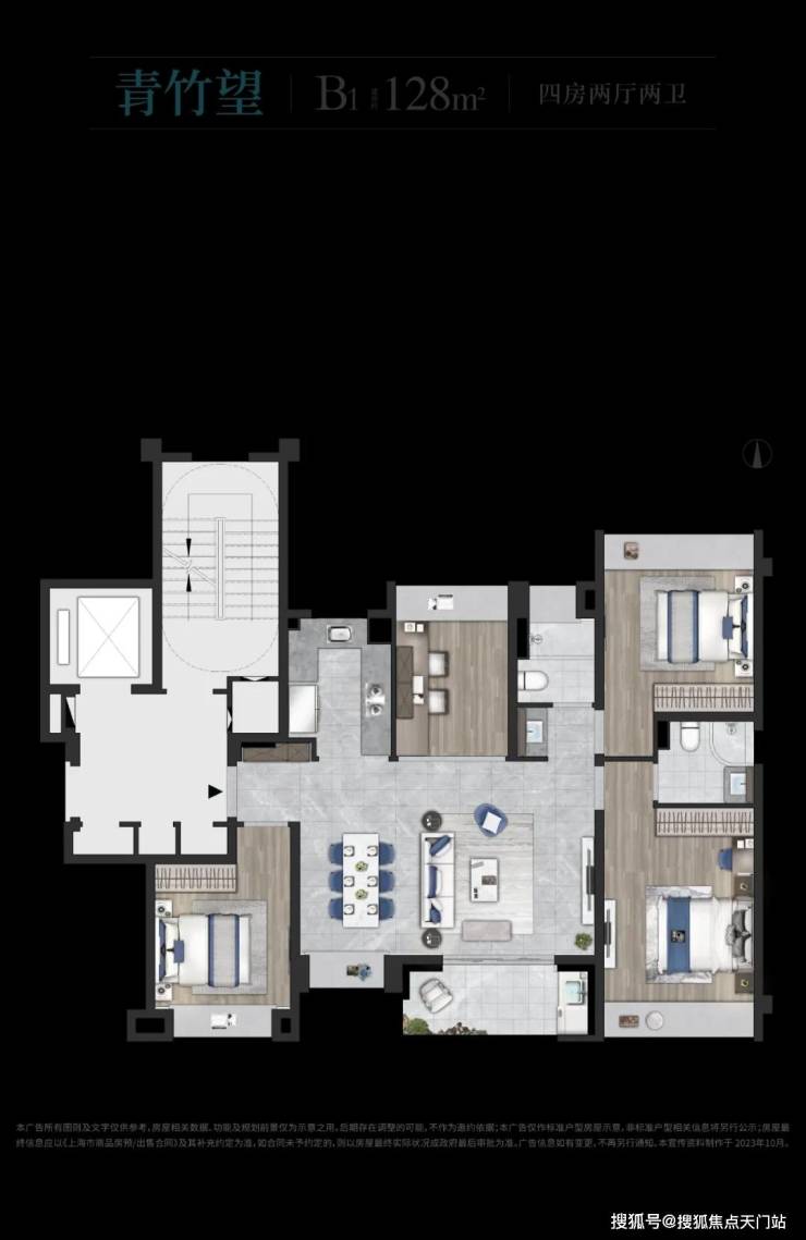 建面约128㎡的四房设计,在空间上使用功能更加扁平化,一站式解决了家庭生活的所有功能,优化居家动线,大大提升空间的居住体验。