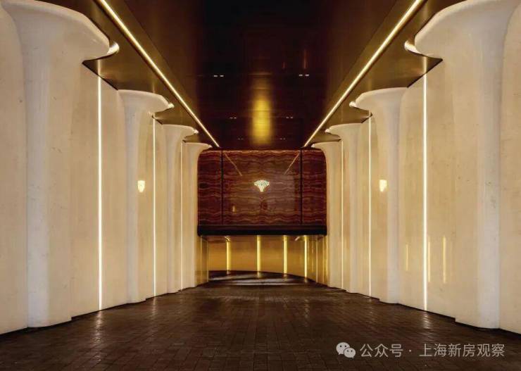 6、 社区含“奢材”量很高。门庭延街的外立面,以精工定制弧形 米色石材为主调,镶嵌典藏级 老虎玉大理石,点缀 古铜色现代海派艺术感灯器,整体呈现出百年海派的贵雅气质。