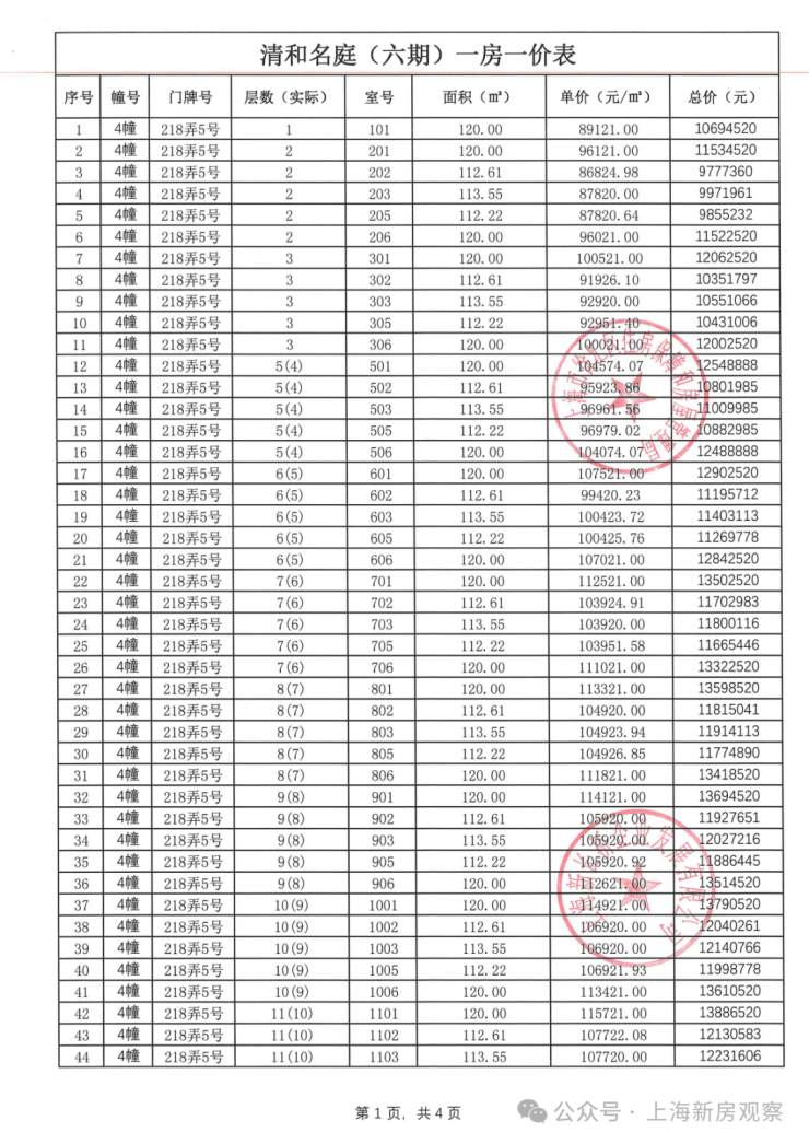 一房一价表如下