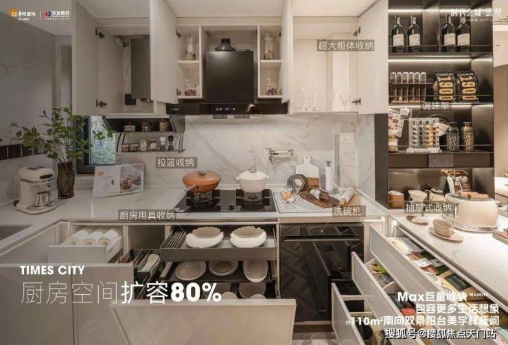 全屋收纳系统尤为突出!U型厨房采用半开放式设计,“分层调味架、下拉篮及踢脚抽”实现高效收纳;