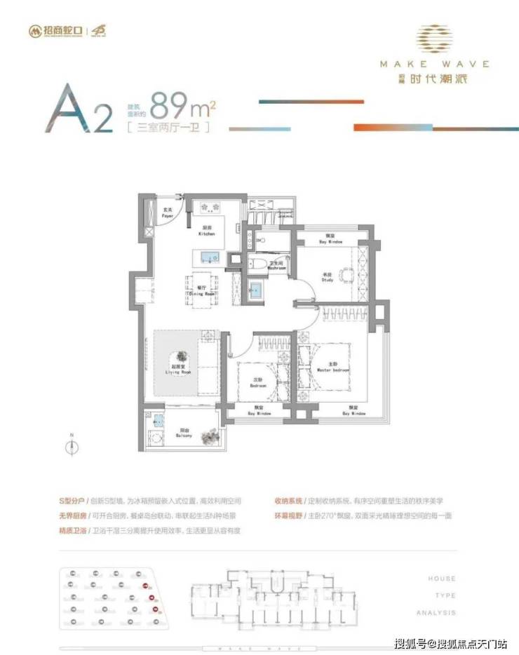 建面约89㎡3房户型:东边套主卧配置约270°双向采光飘窗、S墙设计,主力总价仅约450万级,首付约90万起!
