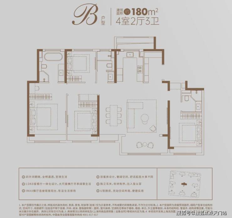 五开间朝南的全明通透,四房两厅三卫,双主卧设计,舒适起居大享不同,使得其居住感相当阔绰,为生活增添更多情景体验。在精巧铺排上,LDKB客餐厅一体化设计,大尺度横厅尽享阔景生活;动线合理的基础之上,户型格局方正,赋予生活幸福美感。