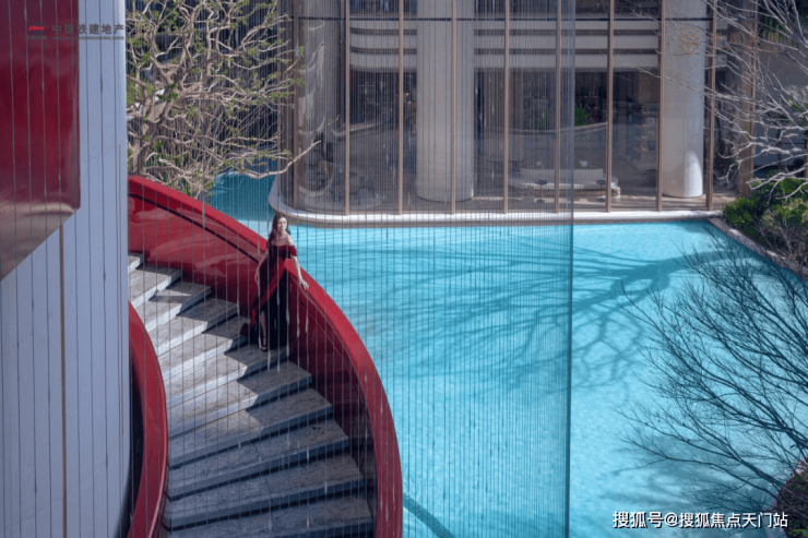 如果将这里理解成“有一个漂亮的水景”,那可能错过了它迷人的部分。它真正在做的事,是把整个社区变成一个立体悬浮的岛屿——你可以在水边发呆,也可以转身走进会所游泳;可以在瀑布声里阅读,也可以拾阶而上与光影相遇。庭院、会所、书吧、旋梯,彼此看见,相互连通,像一座精心设计的立体迷宫,而你每一次穿行其中,都会发现新的惊喜。