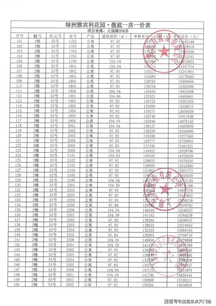 一房一价表如下