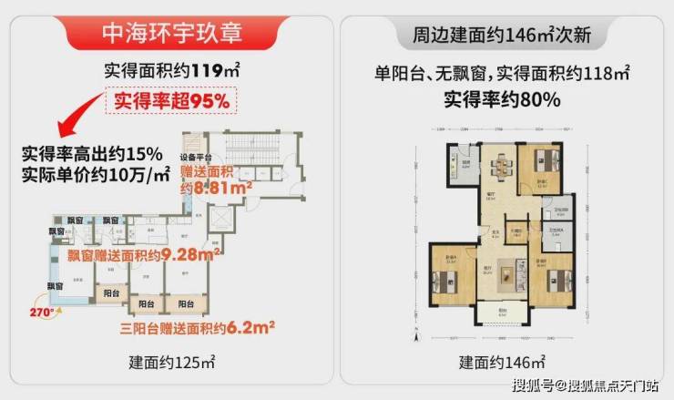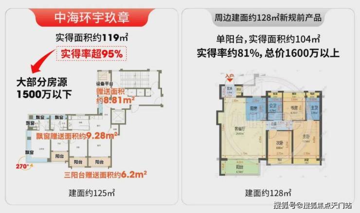 环宇玖章125户型实得率超95%,而宝华项目实得率仅约80%。按同等实用面积折算,环宇玖章实际单价就更划算,仅约10万/㎡。