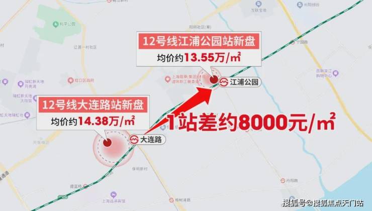 环顾上海内中环,12大连路新房均价14.38万/㎡,相隔一站的江浦公园站新房13.55万/㎡,差价约8000元/㎡。