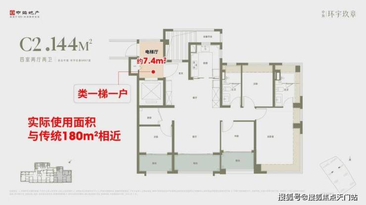 ②、144㎡户型本身实得面积约133㎡,加上专属电梯厅后,整体可用面积可达约141㎡,这一空间尺度已与市面上二手180㎡户型的可使用面积相近。