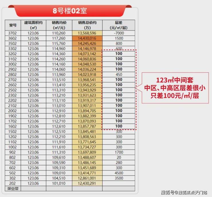 除了显著的均价优势外,中海本次在楼层定价策略上同样诚意十足,主要体现在高中低区优势均衡、楼层价差小、中间套性价比突出三大维度。
