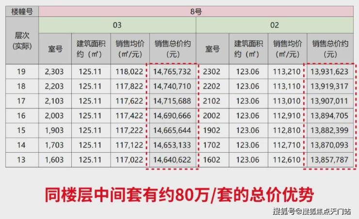 首先,中间套与同楼层边套相比,总价差约80-90万,差额相当于一辆豪车价。