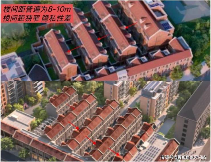 很多市中心低密的风貌别墅,哪怕容积率也在1.2左右,但它们的楼间距并不可观。几乎是在 8-10m, 宽一点的约12m,楼与楼之间非常 紧凑, 私密性难以得到保障。