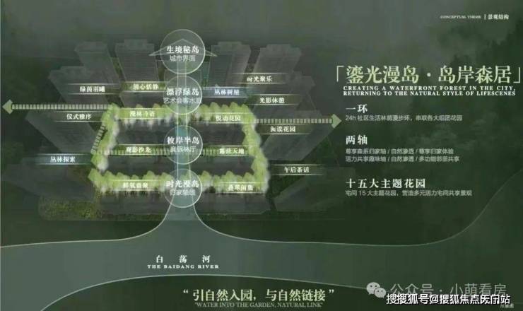 以“山水聚场”理念,规划“一环两轴十五园”景观布局,将水岸、岛屿、森林、花园、树屋作为园林节点,形成“行在景中、坐在岛中、游在林中、意在境中”的美学表达,营造出沉浸式山水活力场域.