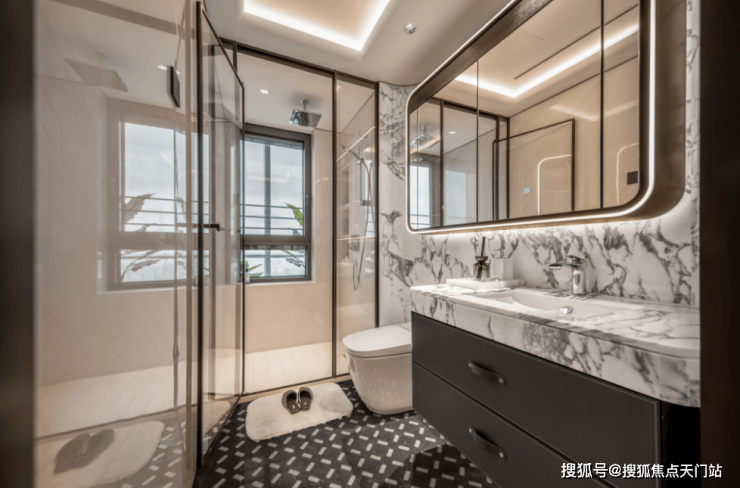 大理石地砖的铺装工艺精湛,近乎看不出拼接缝,呈现出浑然一体的效果;吊顶采用悬浮顶设计,周边用金属包边,层次感十足;卫生间墙面不乏弧形处理,地板纹路的拼法也各有不同,通过复杂的工艺,只为呈现更优的视觉效果。