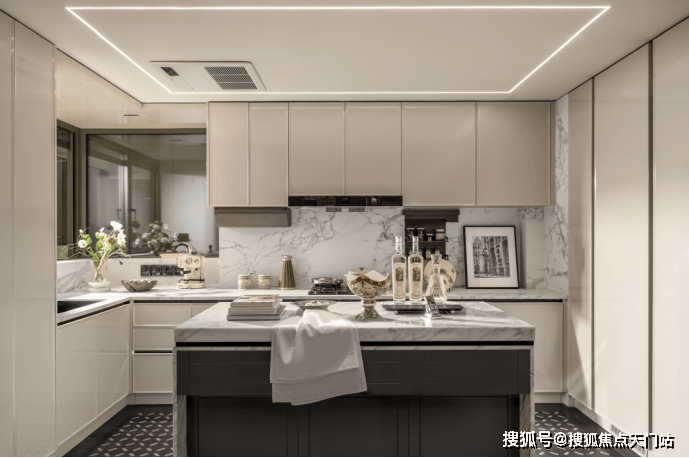 超大尺度的中西岛台 ,既符合中式烹饪的实用逻辑(预留足够操作台面),又能承载西式社交(朋友小聚时在岛台品酒聊天),让厨房从“单一做饭空间”变成“生活场景发生器”。