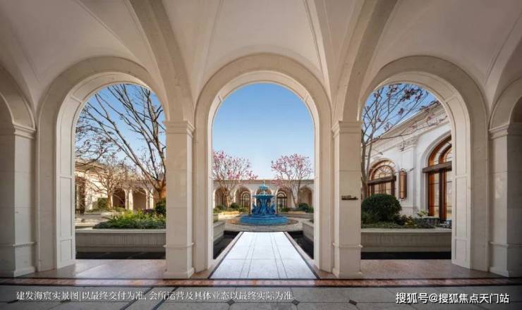 恢弘门头,豪气满满,宽约 65 米, 14 米挑高白玉兰造型穹顶,搭配水景喷泉营造归家仪式感。
