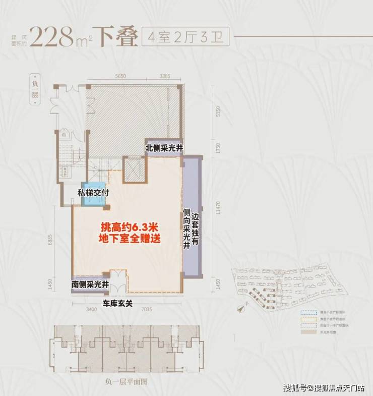 下叠户型地下单层面积约120㎡,层高达约6.3米,可以做双层使 用,增加夹层后, 地下空间可拓展至超200㎡ ,丰富的灵动空间足以满足业主的各类喜好!