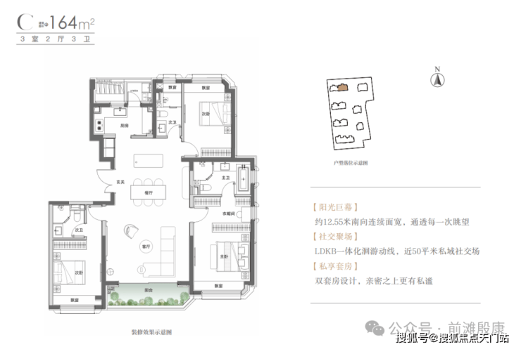 户型三开间朝南,约12.55米南向面宽采光充足,大宽厅空间开阔,采光也相当舒服。三个卧室尺度感全部做到位。主卧配备独立衣帽间与浴缸,南次卧同样采用套间设计,北次卧也可以轻松摆下1.5M双人床+两个床头柜+书桌(只要多看过几个新盘,就知道这个北次卧尺度的含金量)
