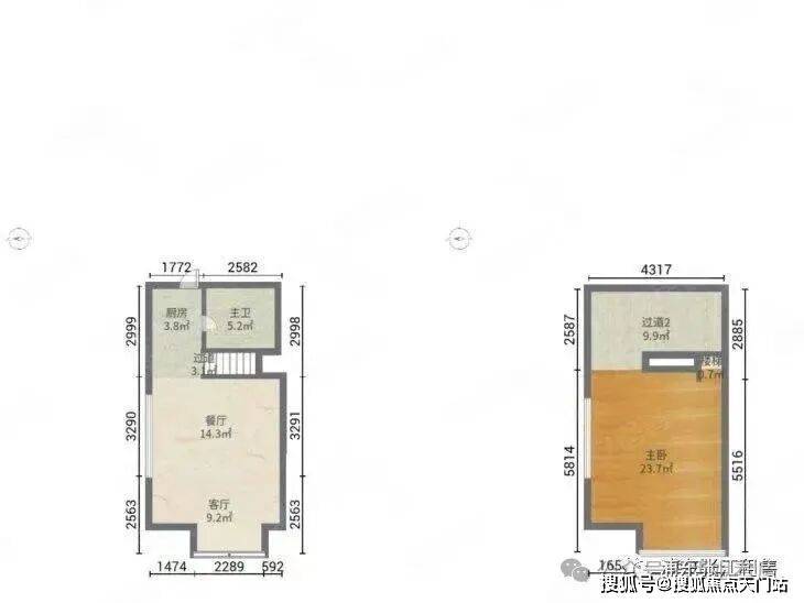 卫生间:1个卫生间设计,布局紧凑。厨房:开放式厨房,油烟恐干扰客厅。。 其他:4.5米挑高,买一层享2层。。 客厅:客厅朝被,带阳台,采光不错。。