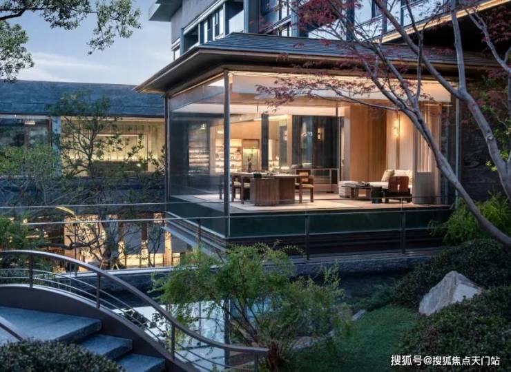 再往里走就是近460㎡的下沉式庭院 , 精选太行山金景石堆叠成小山丘,引进溪水汇聚成池塘,并移栽岭南珍贵的古桩铁冬青和中华原生乌桕树,形成一幅立体山水画卷。