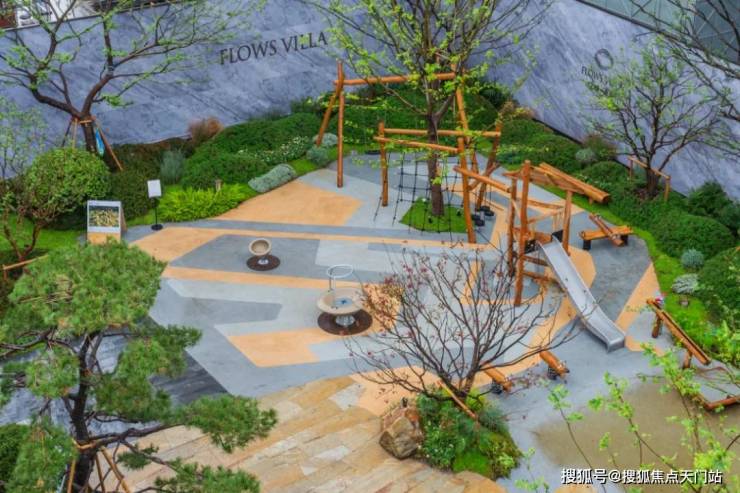 这条绿轴自南向北延伸,以近百平米的镜面水景为起点,溪流蜿蜒,小桥点缀,既保持了建筑组团间的独立性,又通过水声、光影的流动让整个社区和谐共生,营造一种“和而不同、独立共生”的意境和美感。