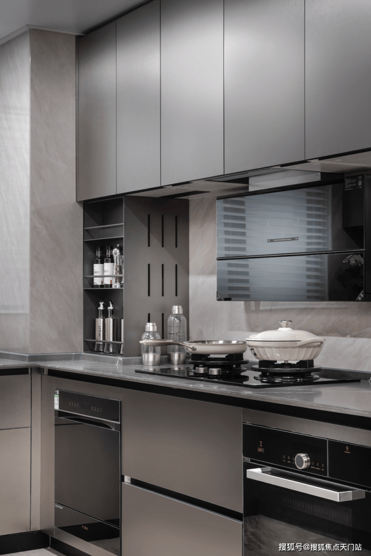 厨房采用 U 字型 设计,石英石台面,比人造石台面更耐热、耐压。同时标配 厨房七件套 包括(油烟机/灶台/洗碗机/蒸烤一体机/冰箱等),还有 末端净水器和凉霸。