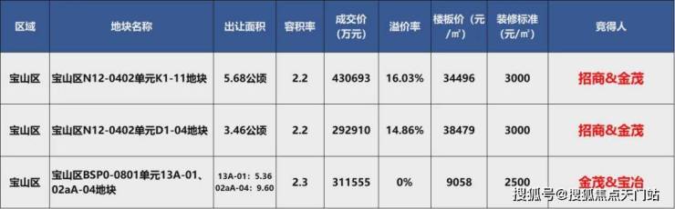 宝山淞南K1-11地块,由金茂&招商竞得, 成交总价43.07亿元,溢价率16.03%;