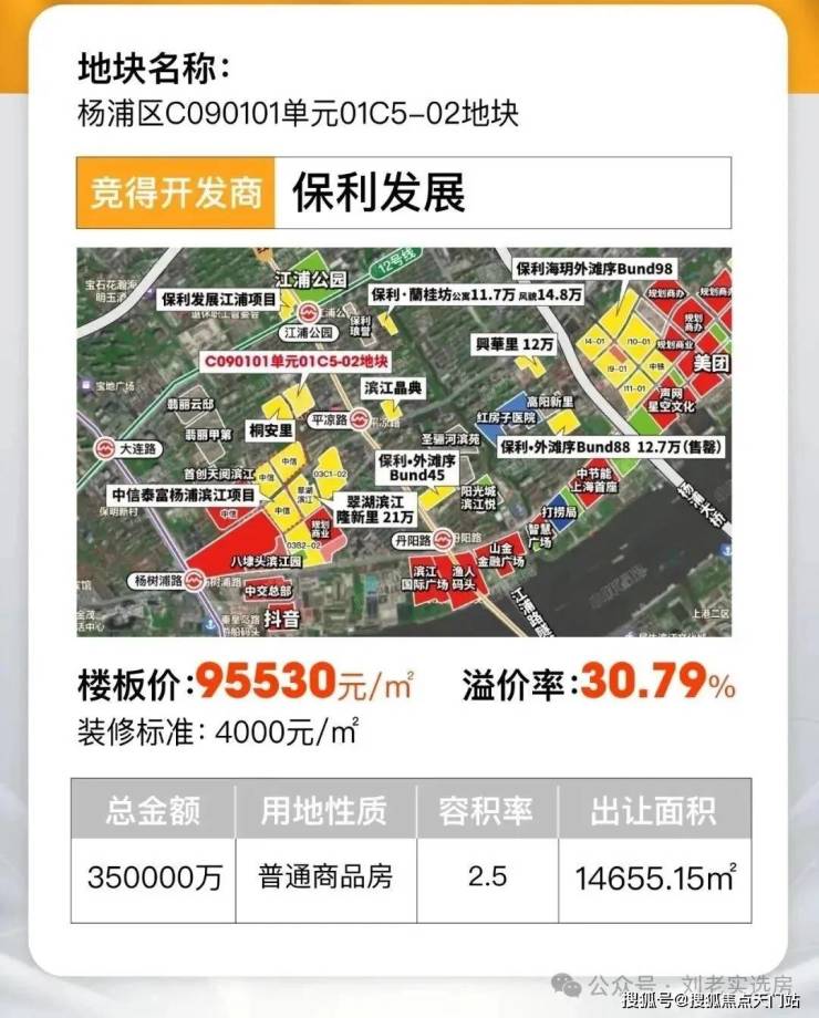 今年5月, 杨浦区N090602单元L4-0 2地块出让,出让结果:以 总价424063万元成交, 溢价率约26.3%、楼面价80199元/㎡。