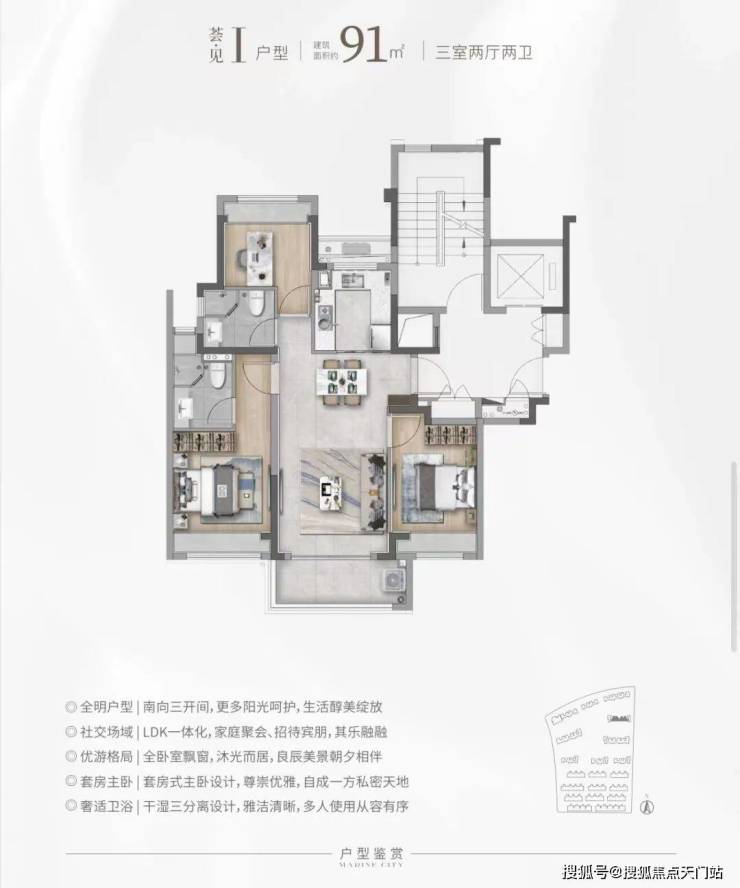 客餐厅厨一体化+大尺度观景阳台,整个公区几乎没有面积浪费,南北通透,同时三开间朝南,户型的采光和通风条件优越。