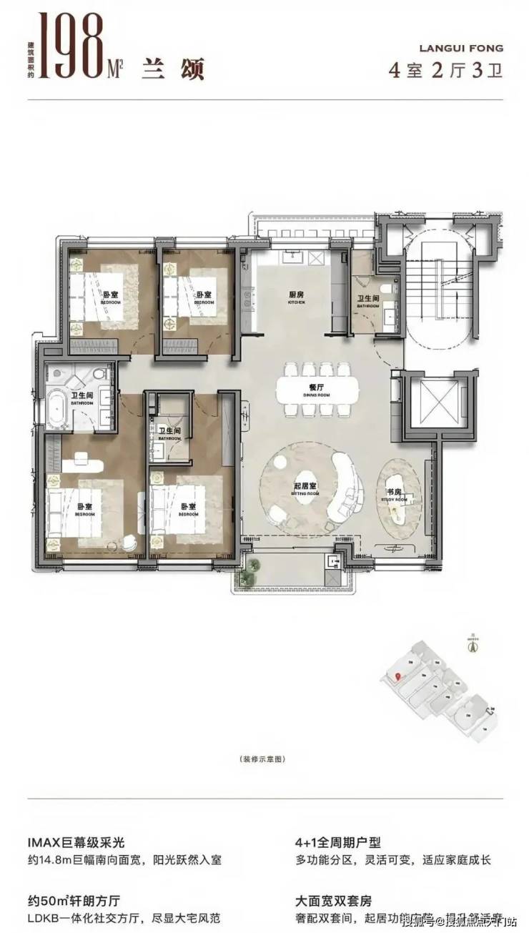 4+1全周期成长性户型,使家庭成员既可以共享社交空间,又拥有充足的私密领域,满足现代家庭多样化以及多代同堂生活需求。