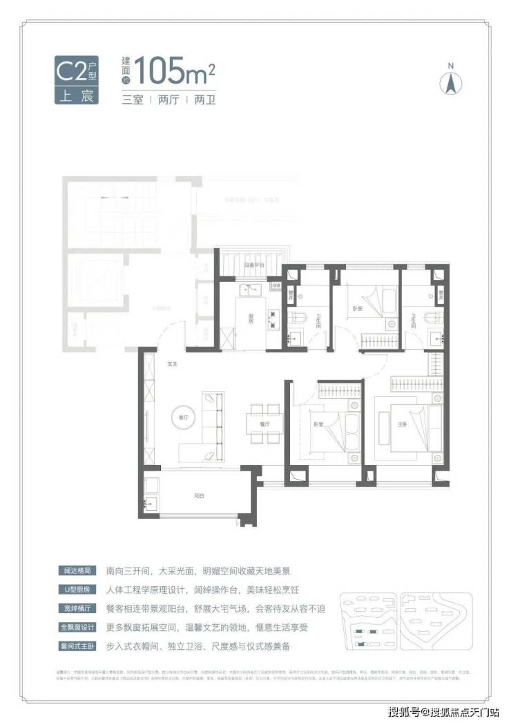 U型厨房、餐厅、客厅、阳台一线联通,南北通透。主卧套房、全卧飘窗、次卫干湿分离也都是标配。