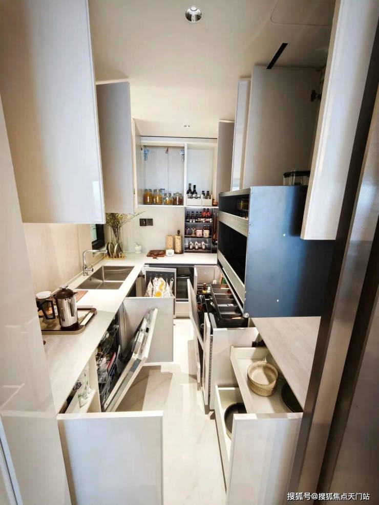 甚至连厨房最容易被遗忘的角落也都做足了收纳,而且不是传统抽屉,只需要轻轻踢一下就能弹开。