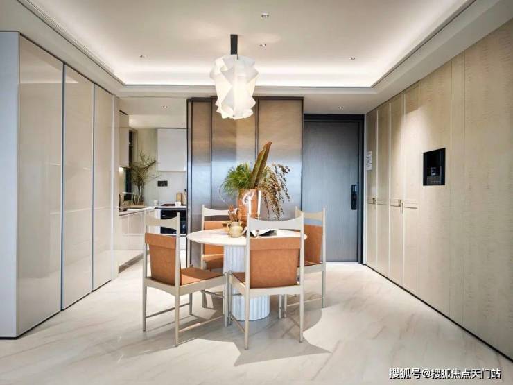 脚下的地也没有被遗忘,客厅地面和部分背景墙是白金沙岩板(建面约140㎡则是罗马白洞石岩板);样板间实拍图