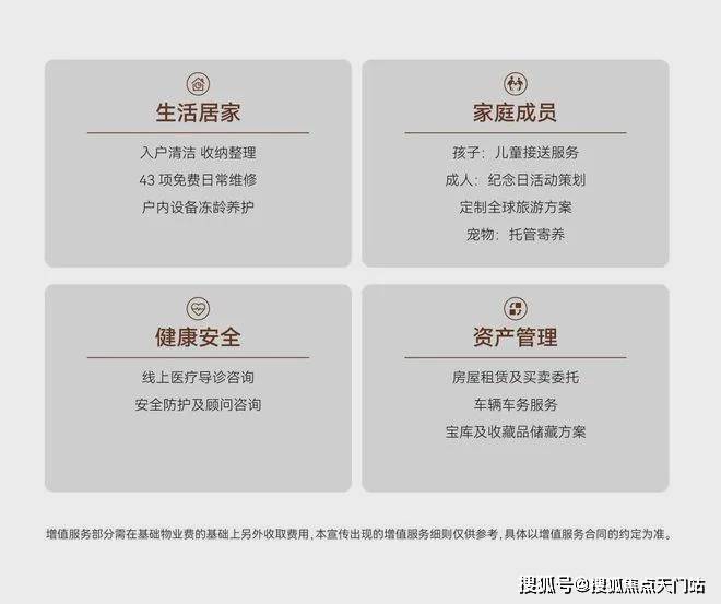 定制增值服务,包含儿童接送服务、入户保洁、43项免费日常维修、宠物托管、私人定制全球旅游方案、车辆养护代检等