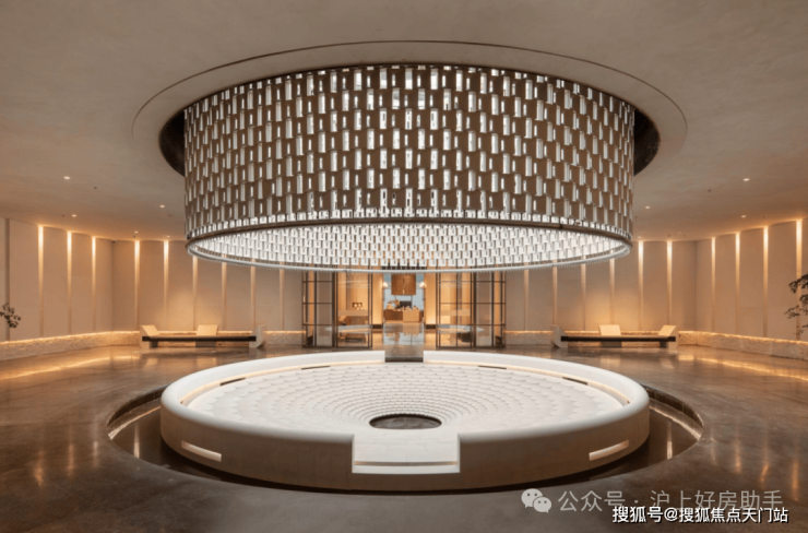 浮光池院水院会客厅,现已实景呈现,水景中央的艺术小品,如一滴水在湖面晕开,泛起阵阵涟漪。