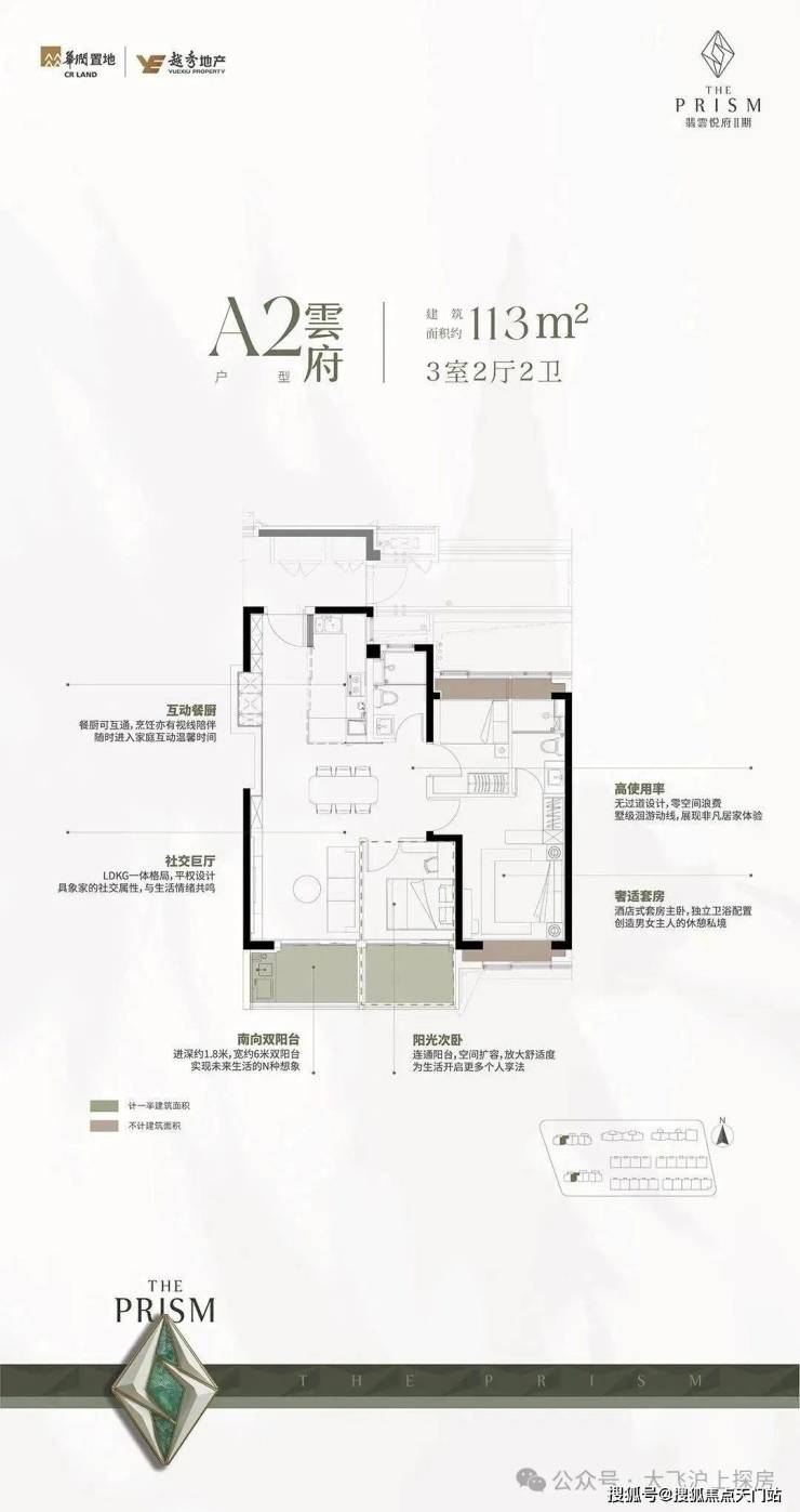 由于处于楼栋中间位置,没有了A1户型的转角飘窗,但延续了南向双阳台和互动餐厨等设计,空间利用一样充分。