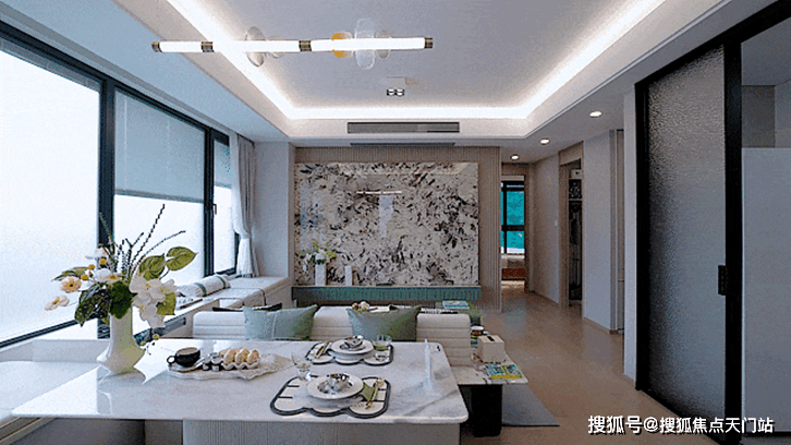 南向3.5面宽边厅的户型设计, 一梯一户的电梯厅基本可以独享;客餐厅一体化设计, 270°的超广视角,居住者足不出户就能坐拥长卷式观景体验; 南向双套卧设置,实现精致而又尊奢的世家生活风范。