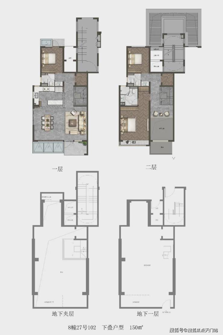 以建面约150㎡下叠户型为例:首层拥有约7.2米的横厅,与南向花园相连;二层的部分区域设计为客厅挑空,让客厅更气派,可以改造为房间增加功能性;地下室层高约5.65米,根据业主喜好设计为酒窖、健身房、SPA室,书房等。