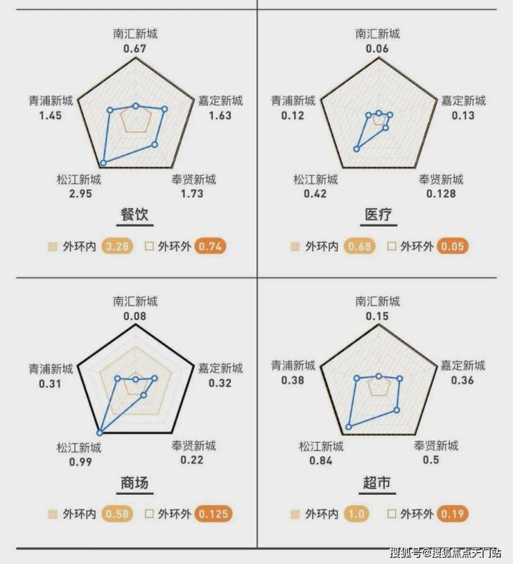 松江新城是上海最早开发的新城,也是最早通地铁的新城,商业医疗等城市配套密集程度在新城中首屈一指,下面这个对比一目了然。
