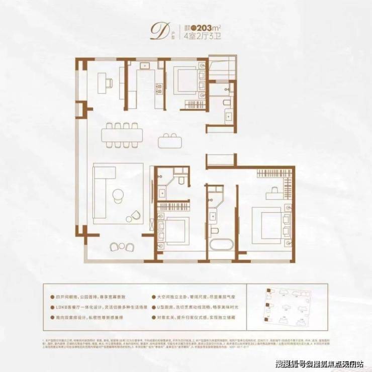 普陀金茂府售楼处电话:400-118-3159建面约172㎡四房的户型,空间设计整体遵循经典美学原则,营造轻奢情调,彰显空间品质感。南向大开间,大尺度横厅设计,餐客厨阳台“LDKG”一体化设计,增加空间尺度感;套房主卧集起居、衣帽、梳妆、卫浴四大功能于一体,南向阳光父母房套房,私享静谧。