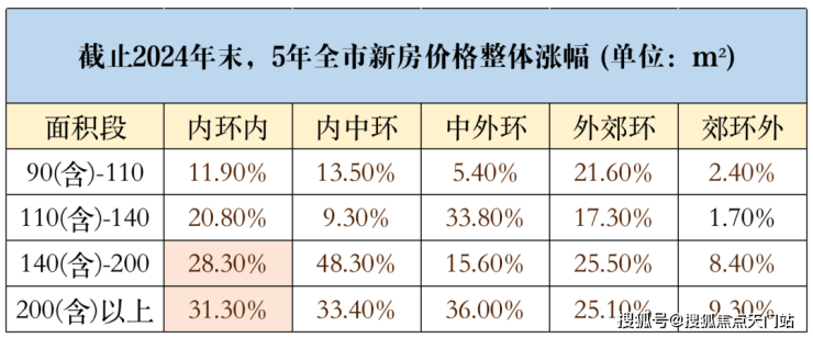 其中价格增幅最明显的是内中环间的140㎡+大户型产品,价格涨幅近乎翻倍。