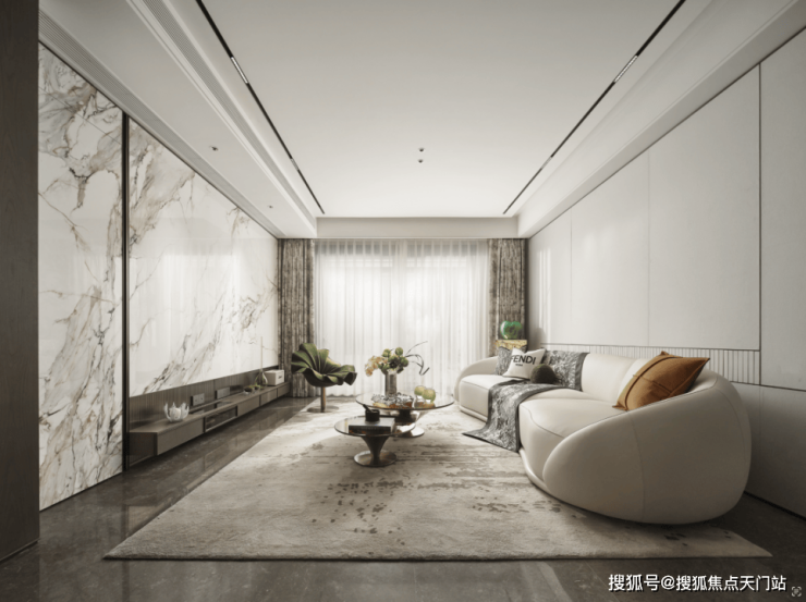 客厅面宽达到约4.2m,空间感和舒适度拉高了一个档次。项目还创新性采用"岩板隐形门"设计,将次卧入口完美融入电视背景墙,呈现极简主义的空间美学。
