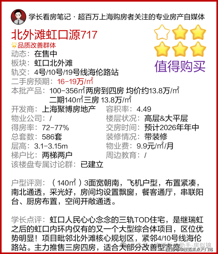 目前「虹口源·717」仍然属于板块内价格洼地状态。