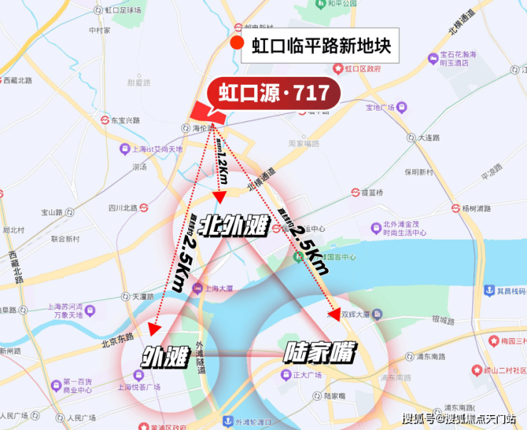 虹口源·717,占位海伦路站,直线距离人广、陆家嘴、北外滩组成的黄金三角仅约1.2km,比虹口新地王还要近,区位更核心,价格却更具性价比!