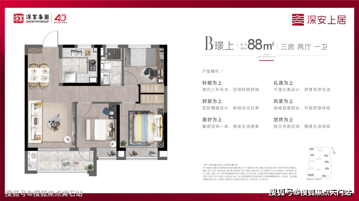 房屋面积:88平-98平(三房)